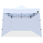 Paired with three full-height white sidewalls, this setup offers added privacy and weather protection while maintaining an open, inviting front. The white walls help reflect sunlight to keep your space cooler—ideal for food vendors, artisan booths, or service stations where a clean, fresh look matters.
